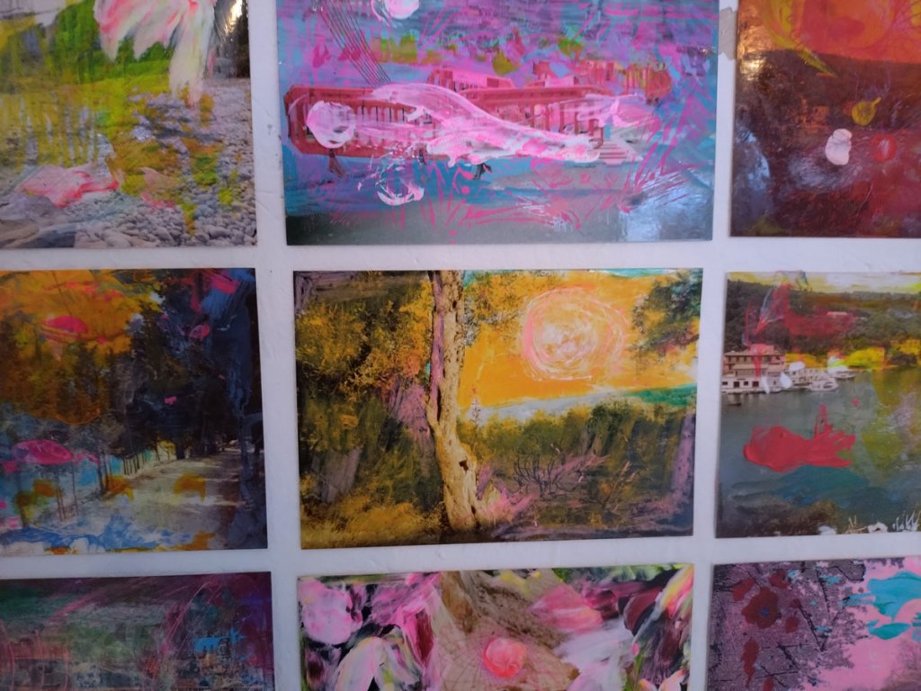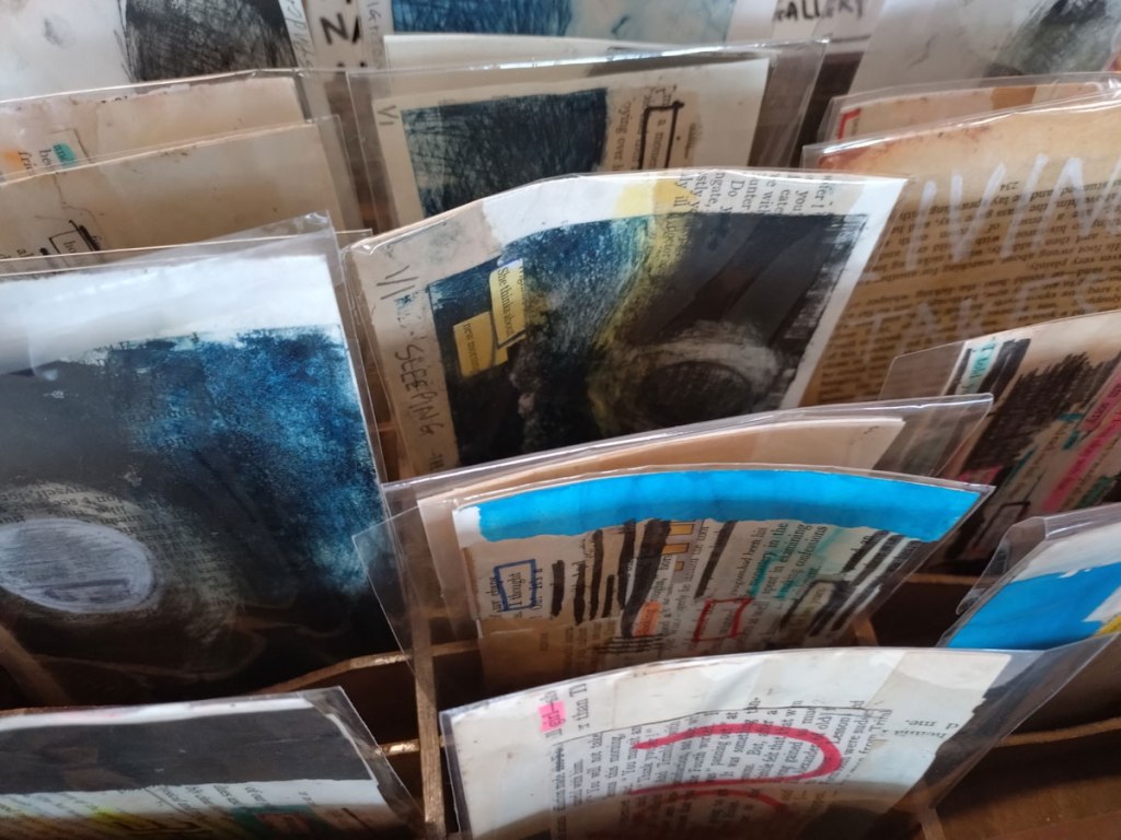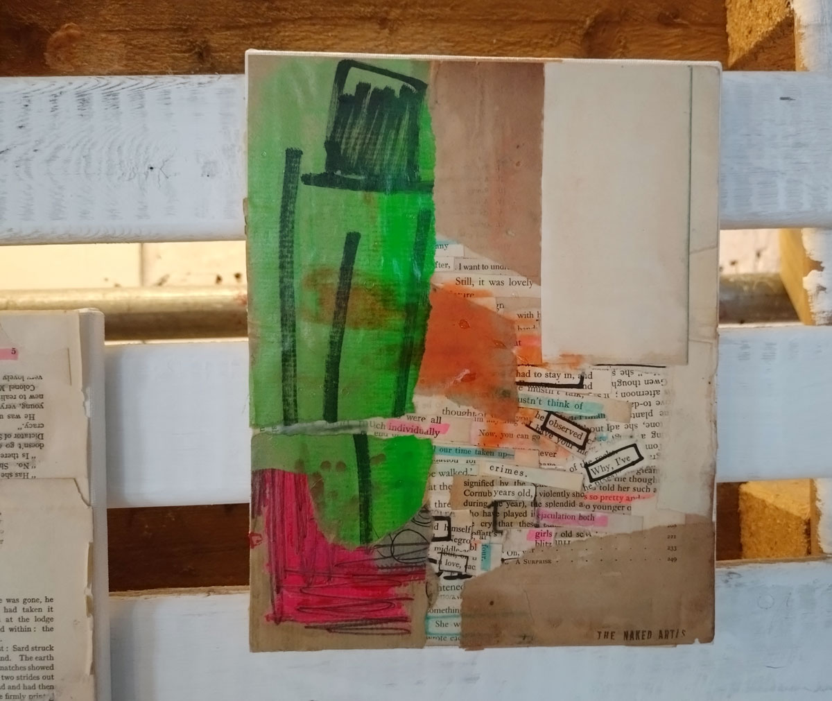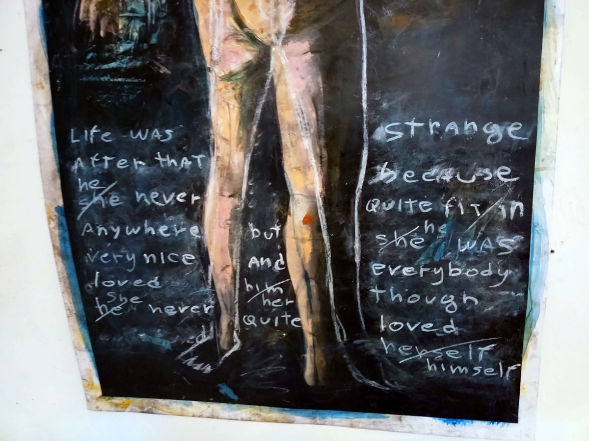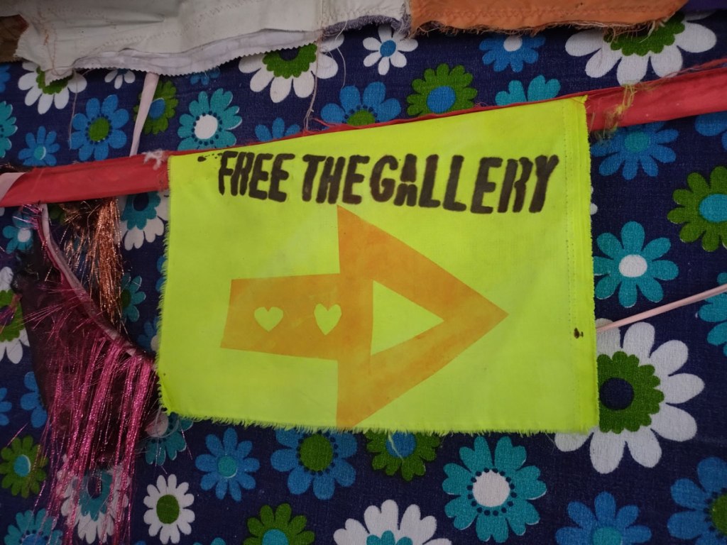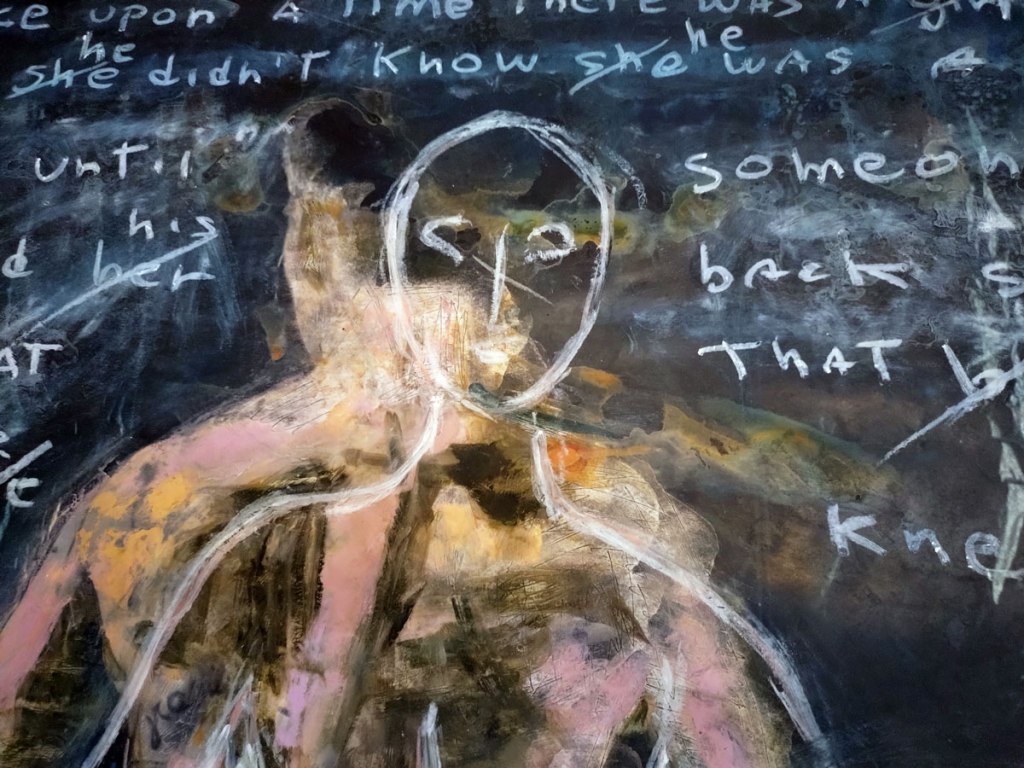 There are quite a few Suzie Pindar pieces I really like, she does often figure somewhere in our shows, I like the part she plays in them, I like her work, I do like her word-covered shoes, her bedhead, her door, there are some things I maybe don’t like so much, this work on these walls in here (or hanging on the fence in here) is amongst her strongest and possibly her most confident? You feel she’s evolving as an artist and that Suitcase Gallery of hers, that suitcase full of art that travels with her that is resting on a bench in here for this show kind of hints of things to come. The art of The Naked Artist, as she likes to be known, is evolving in interesting ways as Suzie Pindar finds herself as an artist (and maybe as a person). I’m never quite sure what Francesca Alaimo‘s art is about, I kind of like that I’m never sure, that it isn’t ever as obvious as it might appear to be at first, I do like this big piece, a new one, a do like how Francesca arrives at a show and unrolls the latest piece, those latest layers of life, the latest slice of painterly mixed media and leaves it hanging there to be considered and thought about through the length of a show and beyond.