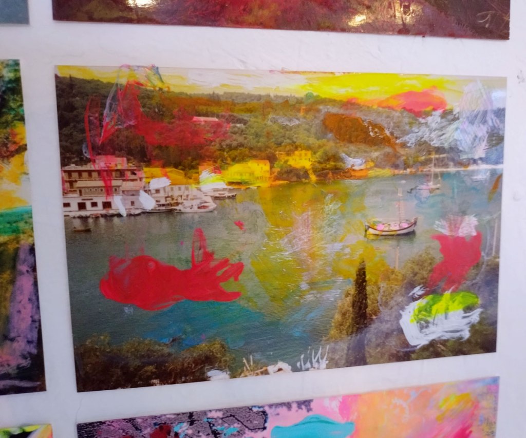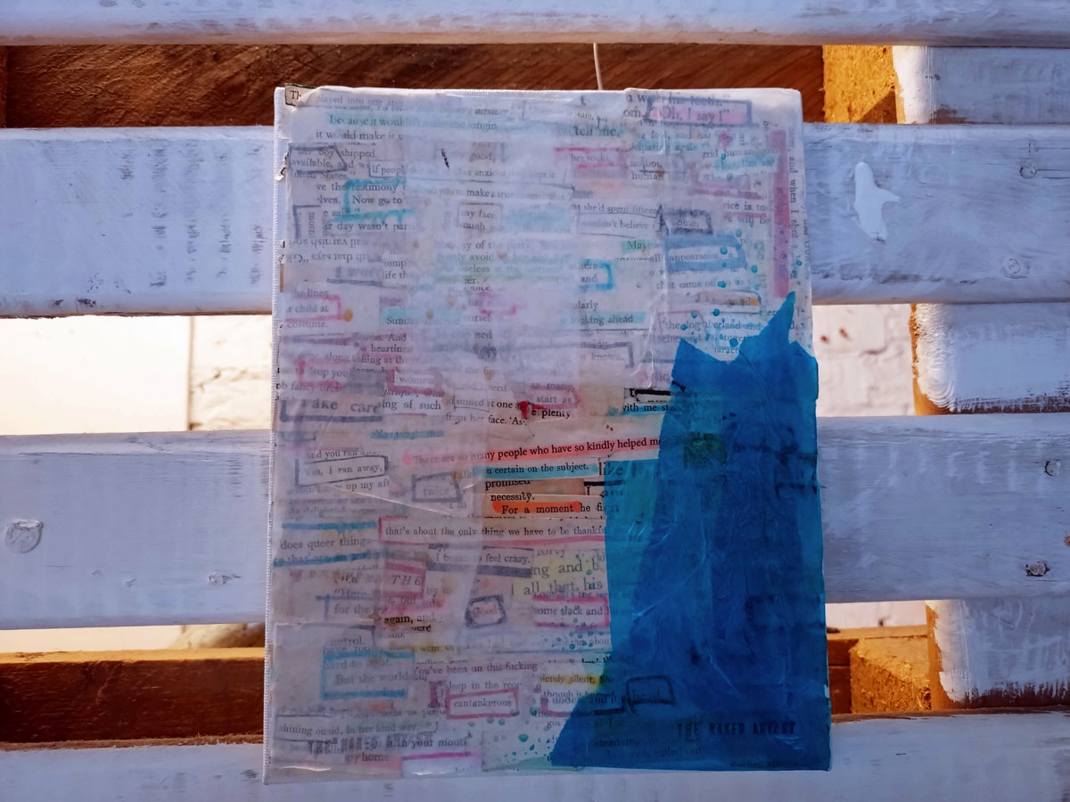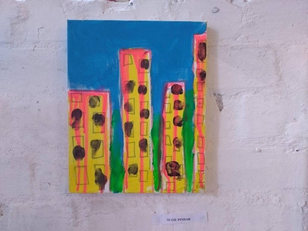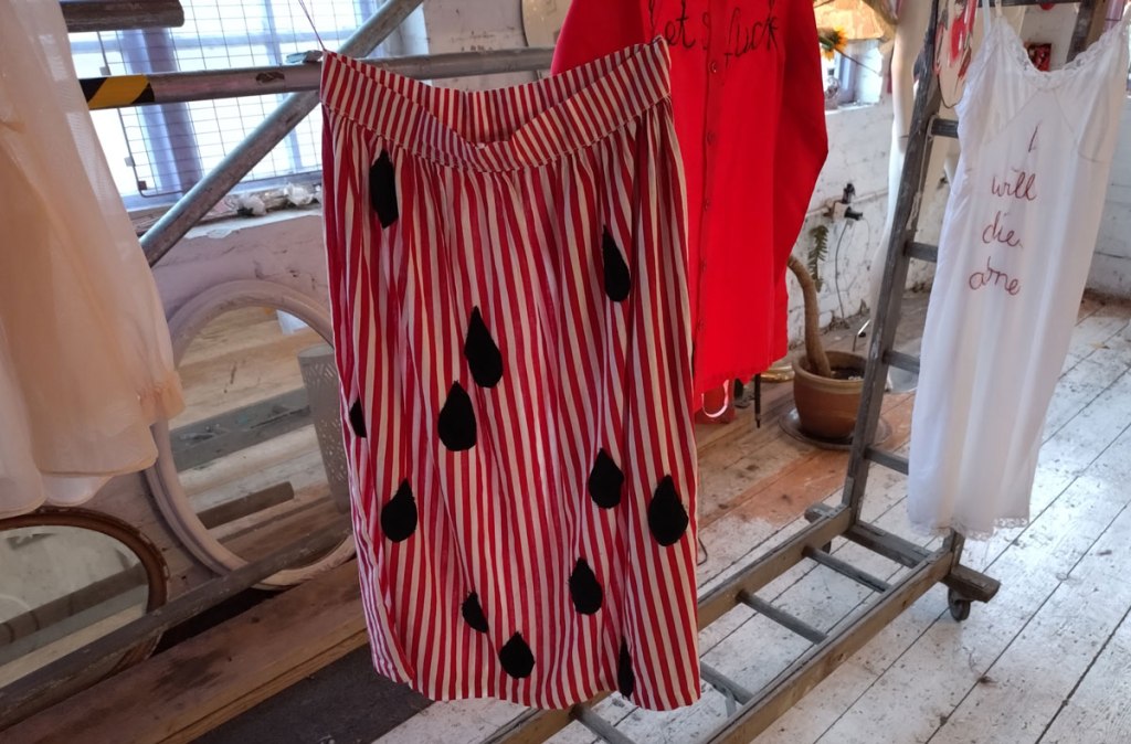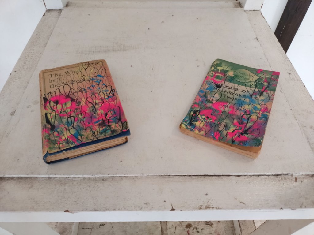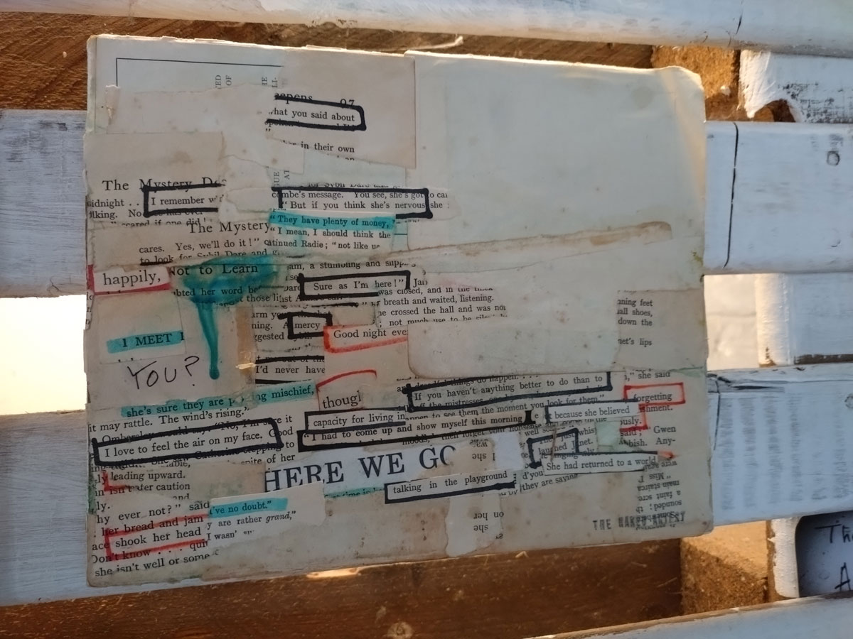 There are quite a few Suzie Pindar pieces I really like, she does often figure somewhere in our shows, I like the part she plays in them, I like her work, I do like her word-covered shoes, her bedhead, her door, there are some things I maybe don’t like so much, this work on these walls in here (or hanging on the fence in here) is amongst her strongest and possibly her most confident? You feel she’s evolving as an artist and that Suitcase Gallery of hers, that suitcase full of art that travels with her that is resting on a bench in here for this show kind of hints of things to come. The art of The Naked Artist, as she likes to be known, is evolving in interesting ways as Suzie Pindar finds herself as an artist (and maybe as a person). I’m never quite sure what Francesca Alaimo‘s art is about, I kind of like that I’m never sure, that it isn’t ever as obvious as it might appear to be at first, I do like this big piece, a new one, a do like how Francesca arrives at a show and unrolls the latest piece, those latest layers of life, the latest slice of painterly mixed media and leaves it hanging there to be considered and thought about through the length of a show and beyond.