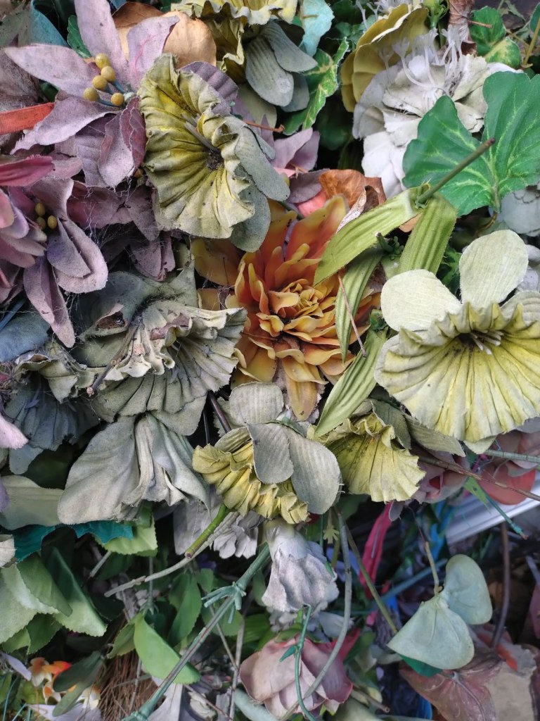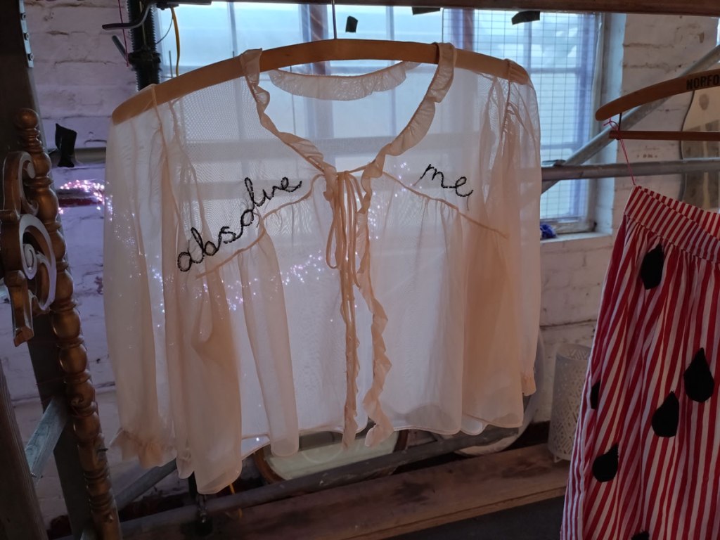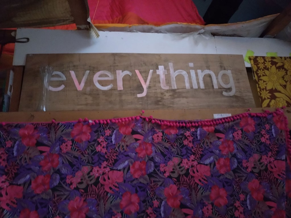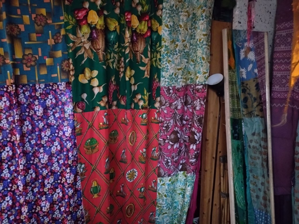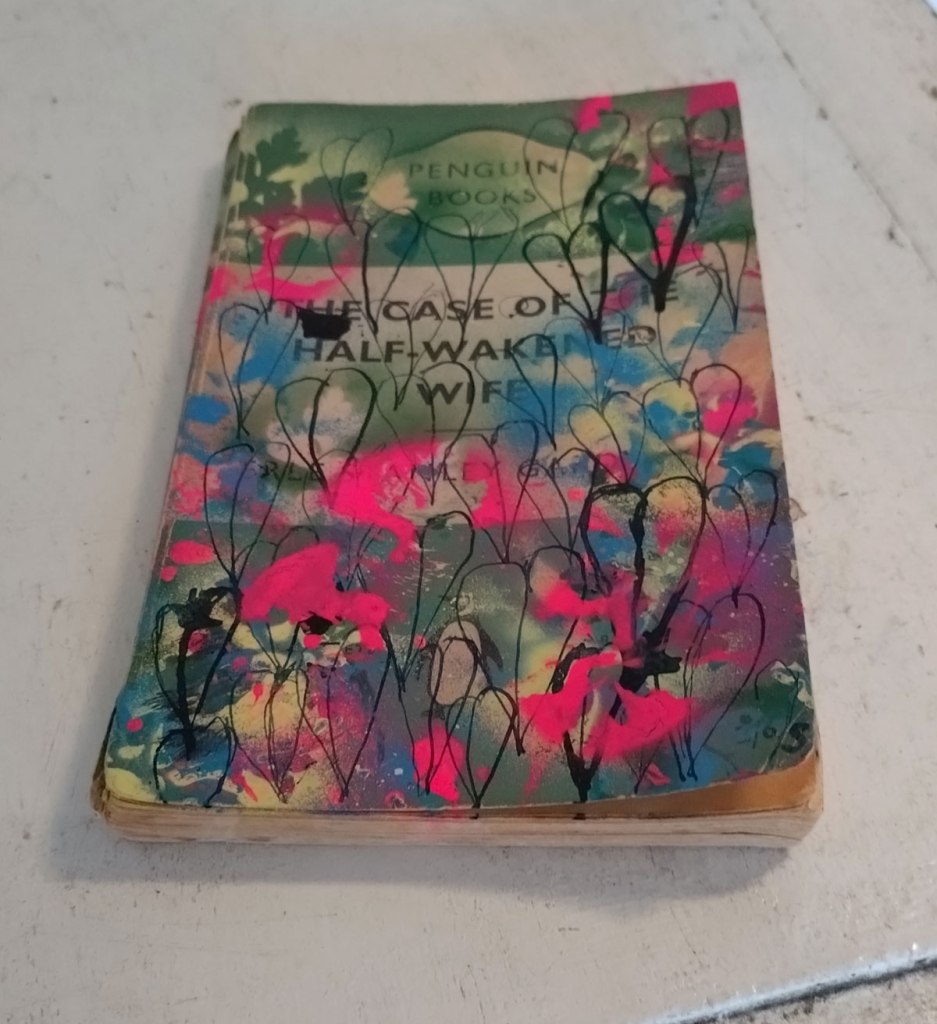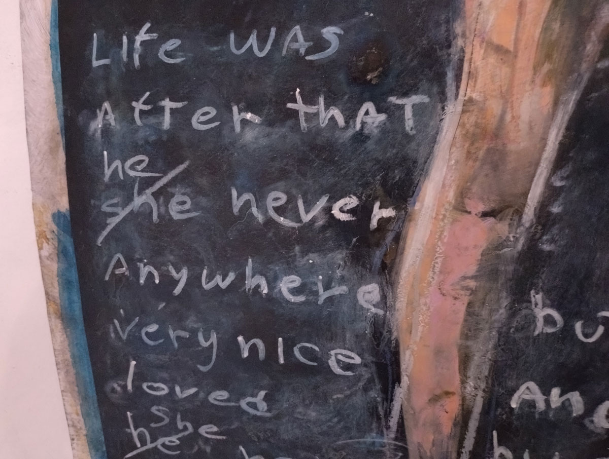 There are quite a few Suzie Pindar pieces I really like, she does often figure somewhere in our shows, I like the part she plays in them, I like her work, I do like her word-covered shoes, her bedhead, her door, there are some things I maybe don’t like so much, this work on these walls in here (or hanging on the fence in here) is amongst her strongest and possibly her most confident? You feel she’s evolving as an artist and that Suitcase Gallery of hers, that suitcase full of art that travels with her that is resting on a bench in here for this show kind of hints of things to come. The art of The Naked Artist, as she likes to be known, is evolving in interesting ways as Suzie Pindar finds herself as an artist (and maybe as a person). I’m never quite sure what Francesca Alaimo‘s art is about, I kind of like that I’m never sure, that it isn’t ever as obvious as it might appear to be at first, I do like this big piece, a new one, a do like how Francesca arrives at a show and unrolls the latest piece, those latest layers of life, the latest slice of painterly mixed media and leaves it hanging there to be considered and thought about through the length of a show and beyond.