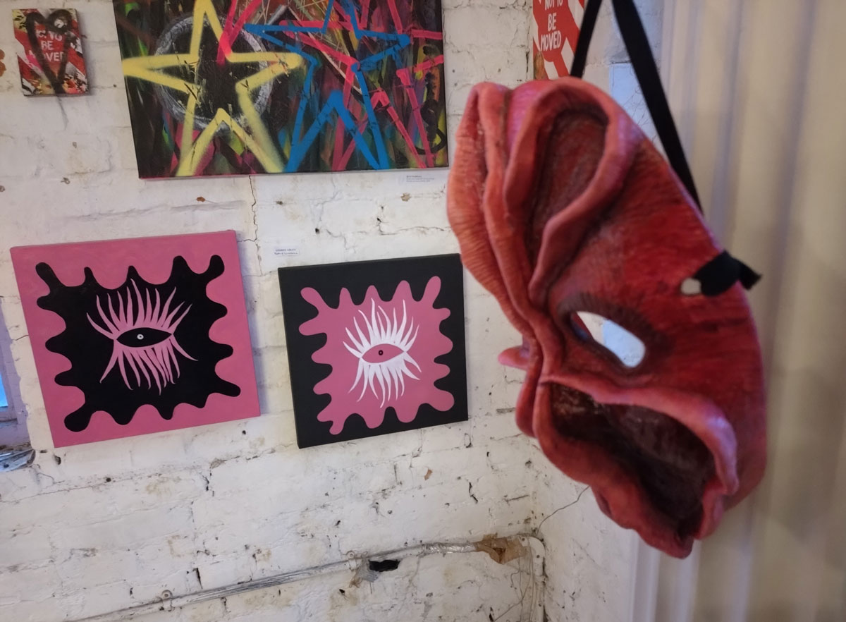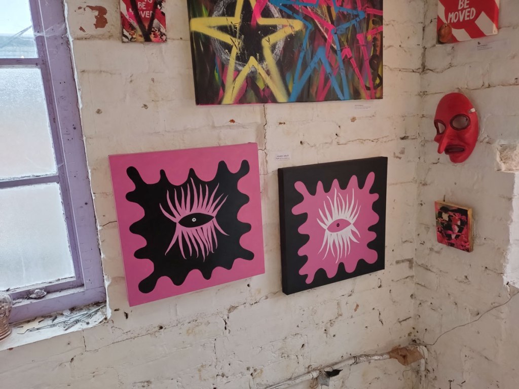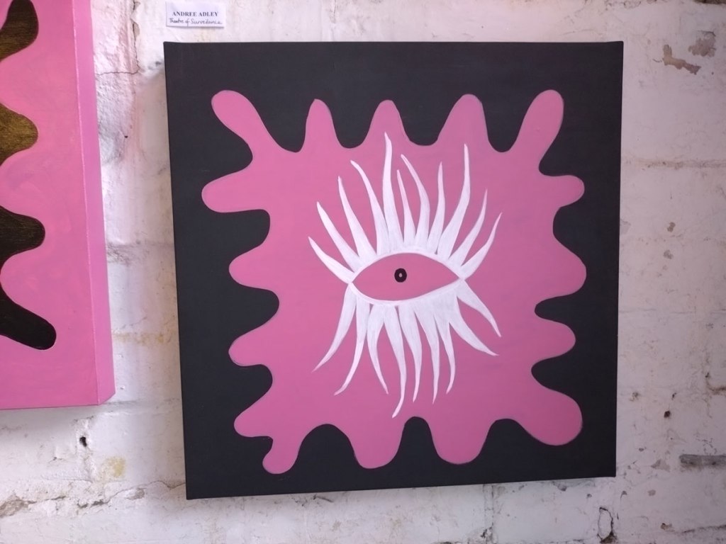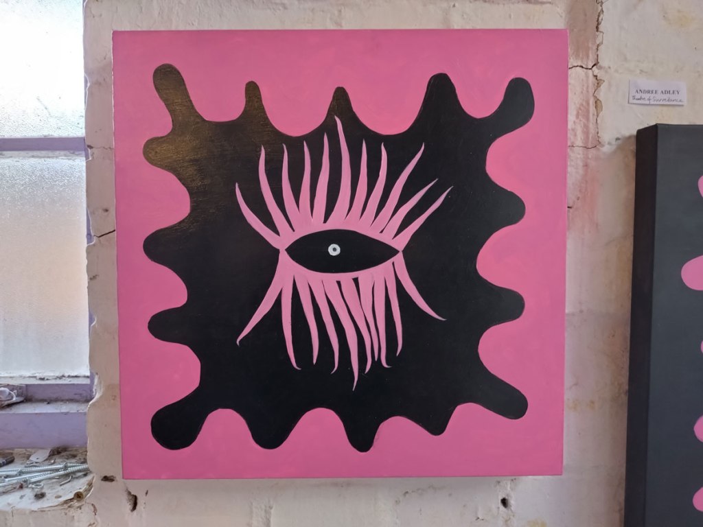 Andree Adley’s stylised paintings are once again watching us from the walls, we’re looking at her eyes, they’re looking at us, her eyes are (all?) about the way we allow ourselves to be watched without question, her smaller paintings are up there looking down on us, it isn’t the only thing she does or paints or says but it is a rather important part of her work and I do rather like the way Andree Adley paints those almost octopus-like glam rock tentacled eyes. I also like the way Andree is a pro-active painter/maker of things and also a rather prolific DIY curator, that she does what she does in a positive artist-friendly artist-led way, I like the manner of her Secret Salons and such, I might not like everything she exhibits in her own group shows from other artists, she is one of our artistic alleys though, we need more people at least trying to make things happen in these fractured art-scene mostly cynically artist-exploiting times. I like Andree’s eyes.