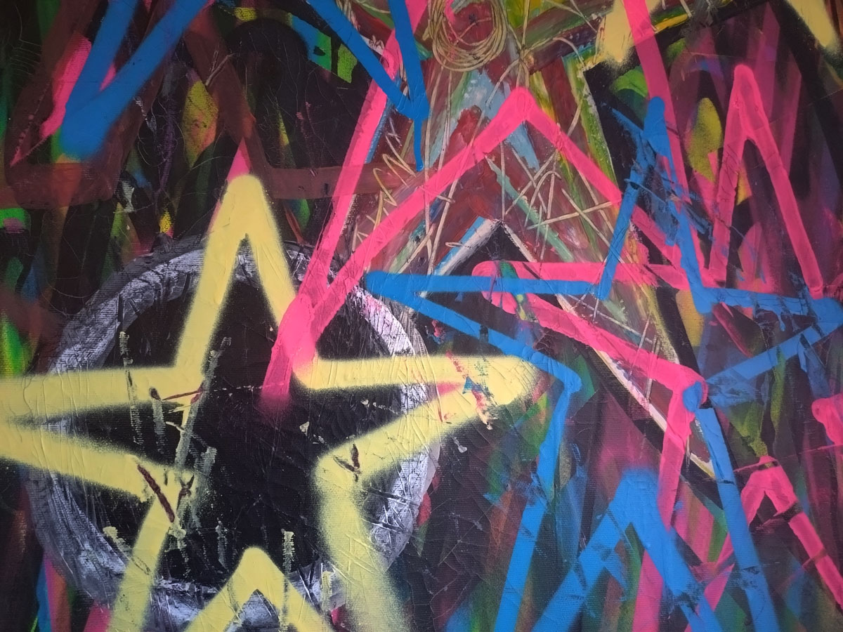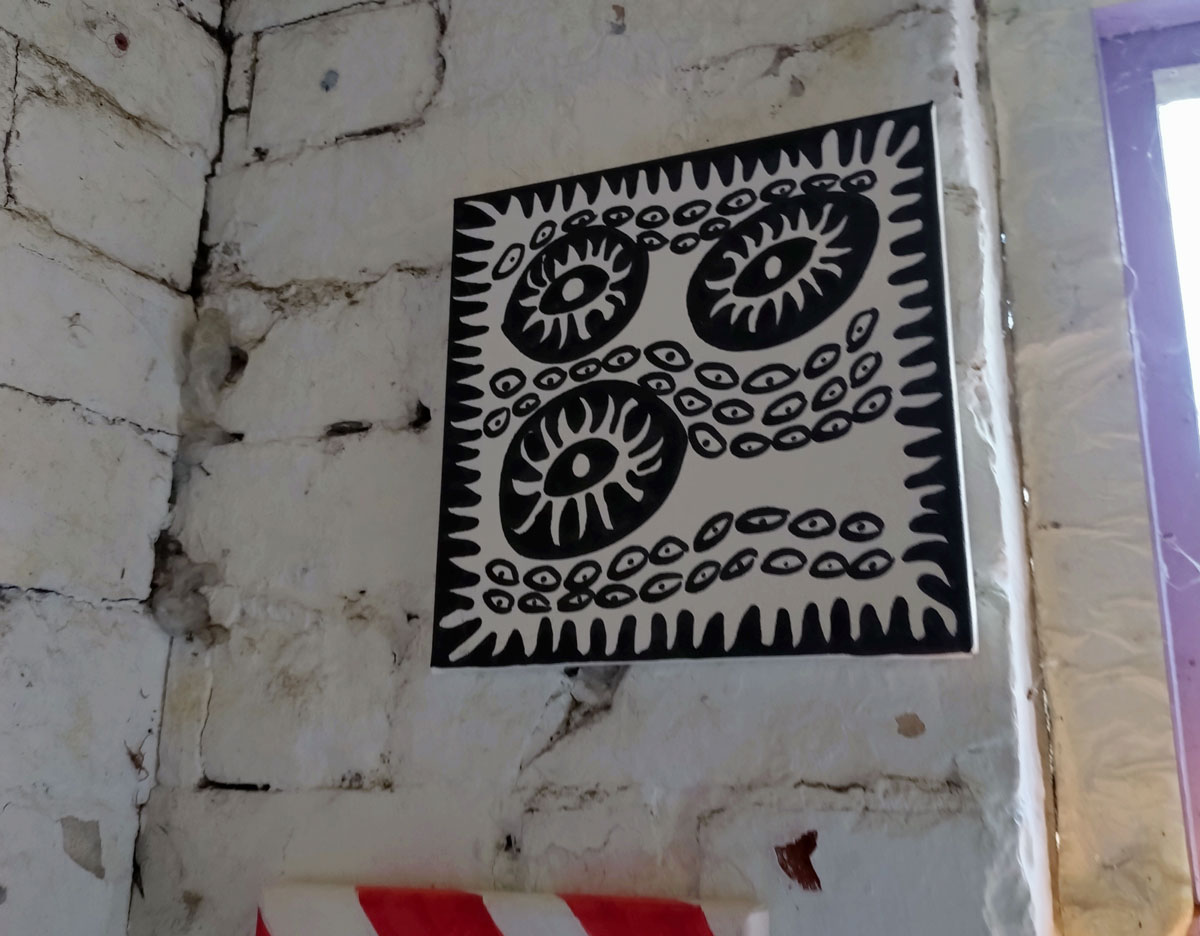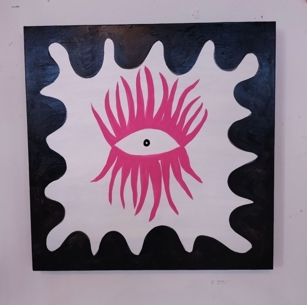 Andree Adley’s stylised paintings are once again watching us from the walls, we’re looking at her eyes, they’re looking at us, her eyes are (all?) about the way we allow ourselves to be watched without question, her smaller paintings are up there looking down on us, it isn’t the only thing she does or paints or says but it is a rather important part of her work and I do rather like the way Andree Adley paints those almost octopus-like glam rock tentacled eyes. I also like the way Andree is a pro-active painter/maker of things and also a rather prolific DIY curator, that she does what she does in a positive artist-friendly artist-led way, I like the manner of her Secret Salons and such, I might not like everything she exhibits in her own group shows from other artists, she is one of our artistic alleys though, we need more people at least trying to make things happen in these fractured art-scene mostly cynically artist-exploiting times. I like Andree’s eyes.