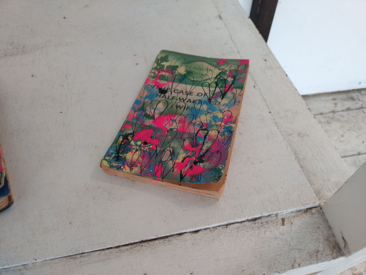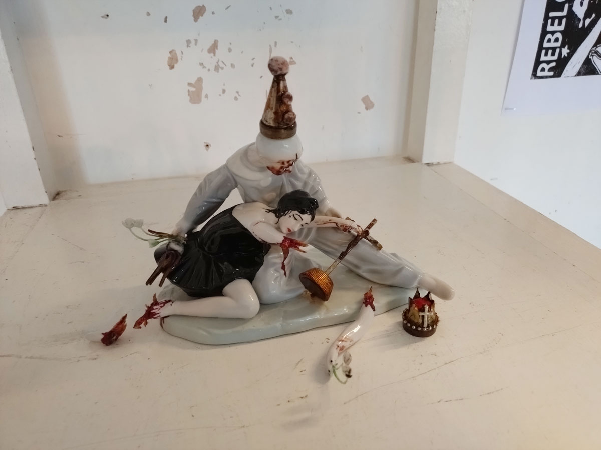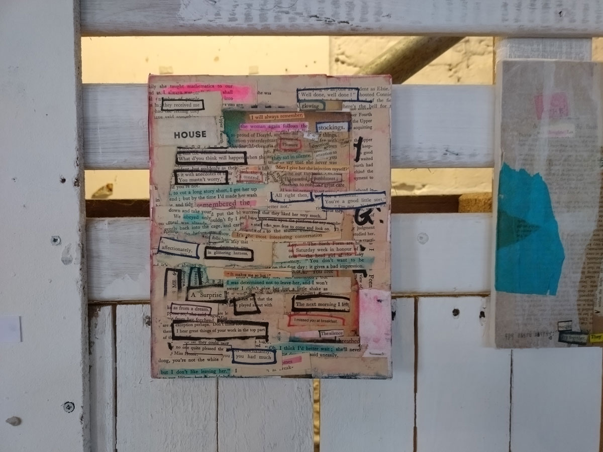 Now of course I like the work of all the artists, they wouldn’t have been invited if that wasn’t the case, we are very (very) picky about these things, and hang apart (and the dissatisfaction in terms of my own art), I was really pleased with most of what was on the walls and the floors. A lot of consideration goes into gathering art and artists who we think will work together, who’s art will work in the right way with the other pieces. It might not be obvious to invite a painter like Jeremy Scott to be in the same show as those Mia Jane Harris figures or Suzie Pindar’s cut up words but we do put these things together in our heads first, there is lots of (sometimes heated) debate before hand, these things are not accidental and hopefully the conversations the pieces have with each other brings out something.