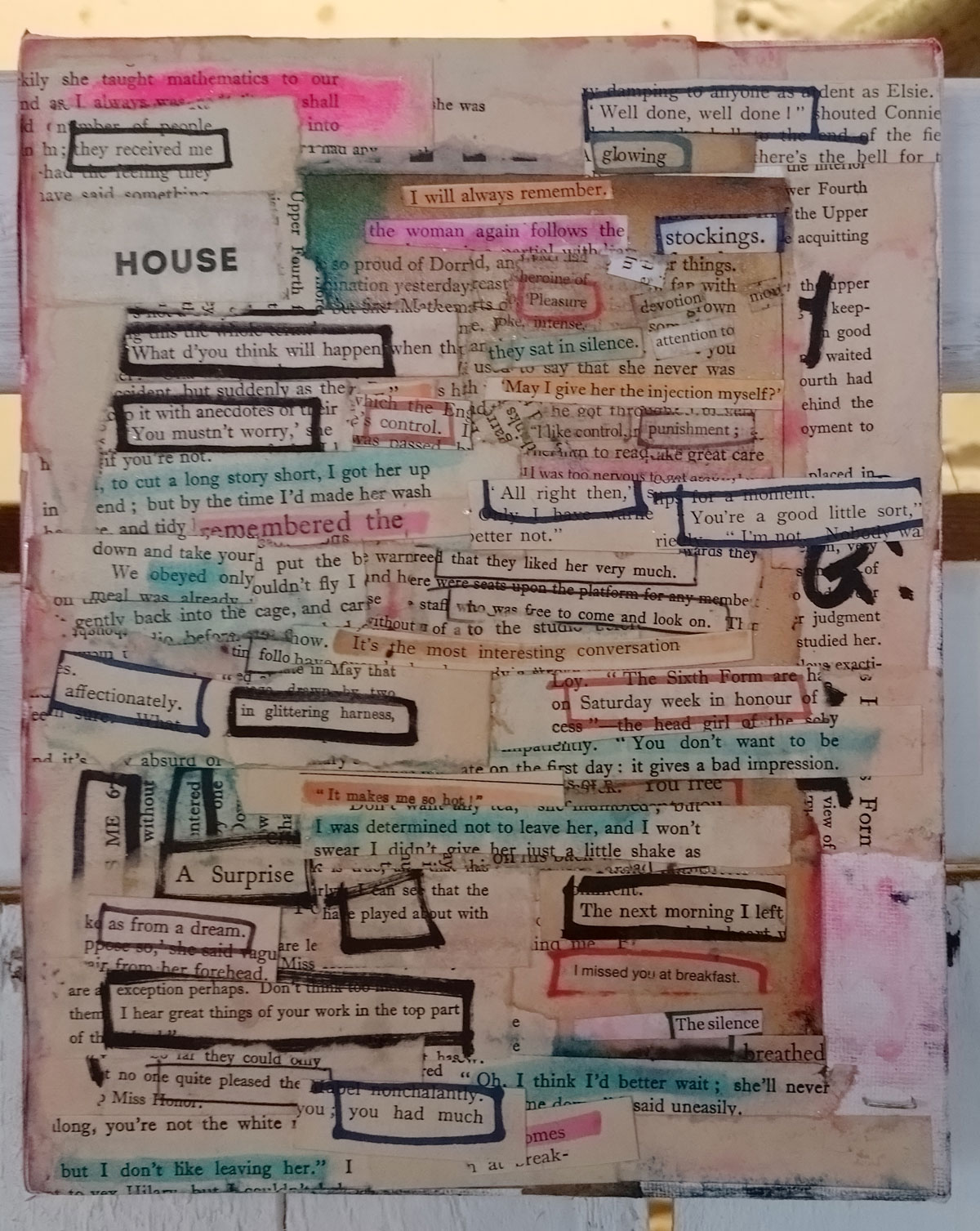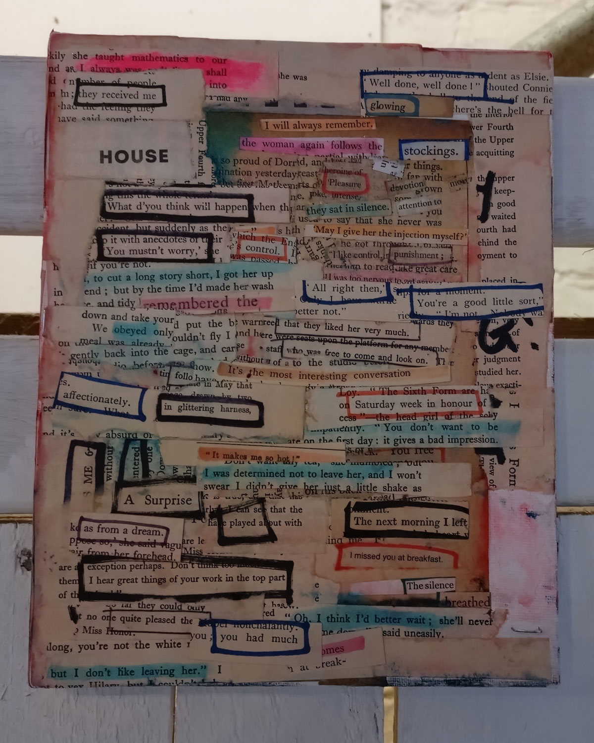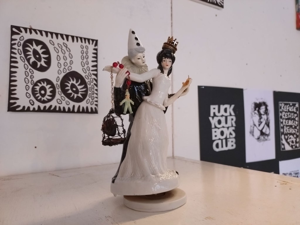 Now of course I like the work of all the artists, they wouldn’t have been invited if that wasn’t the case, we are very (very) picky about these things, and hang apart (and the dissatisfaction in terms of my own art), I was really pleased with most of what was on the walls and the floors. A lot of consideration goes into gathering art and artists who we think will work together, who’s art will work in the right way with the other pieces. It might not be obvious to invite a painter like Jeremy Scott to be in the same show as those Mia Jane Harris figures or Suzie Pindar’s cut up words but we do put these things together in our heads first, there is lots of (sometimes heated) debate before hand, these things are not accidental and hopefully the conversations the pieces have with each other brings out something.