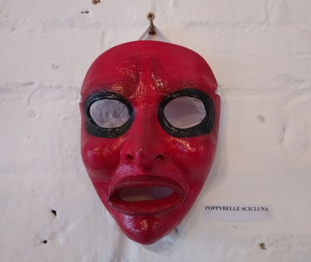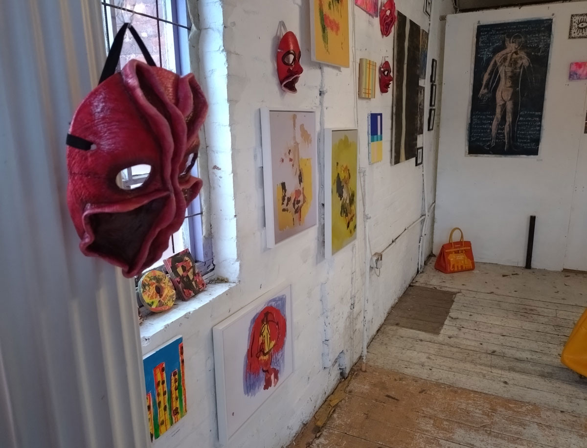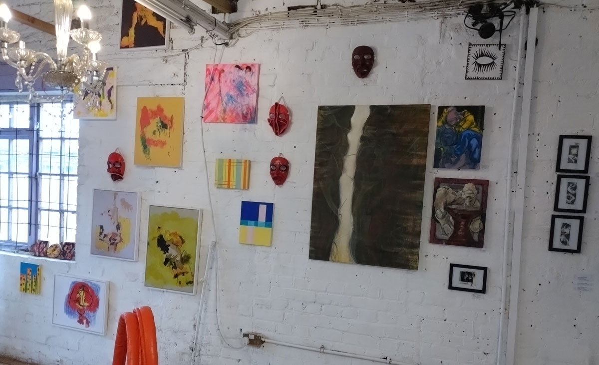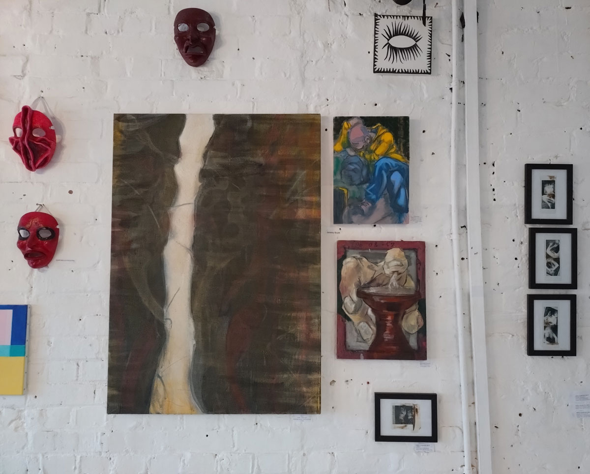 Really wanted some Julia Maddison in this one, she has been showing with Cultivate for ten years or more now, this space particularly lends itself to what she does and who she is (not that we’ve worked out who she is yet, not by any means). meanwhile those Jeremy Scott paintings are dark, weighty, they hang heavy of the old whitewashed brick walls of this space, some kind of gravitas, next to the deliciously red masks of Poppybelle Scicluna and the lines and angles of Mary T. Spence and her refreshing colour. The first time Jeremy has exhibited physically with us after showing in a couple of out online shows. Those two smaller Mary T. Spence paintings are as big as anything in this show, i do like her lines, I do like the choices she makes in terms of her colour.