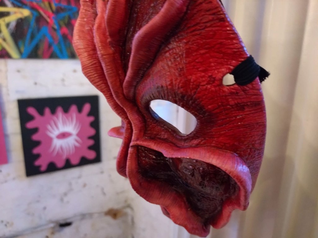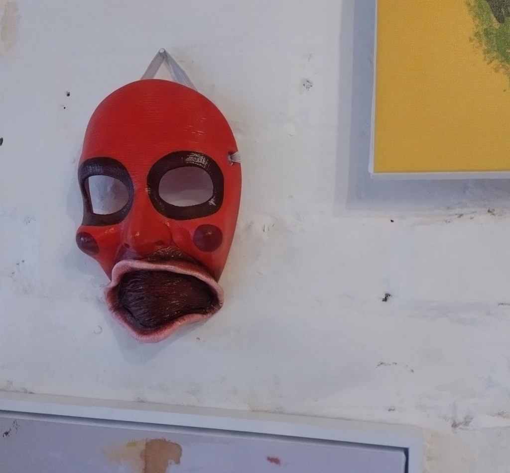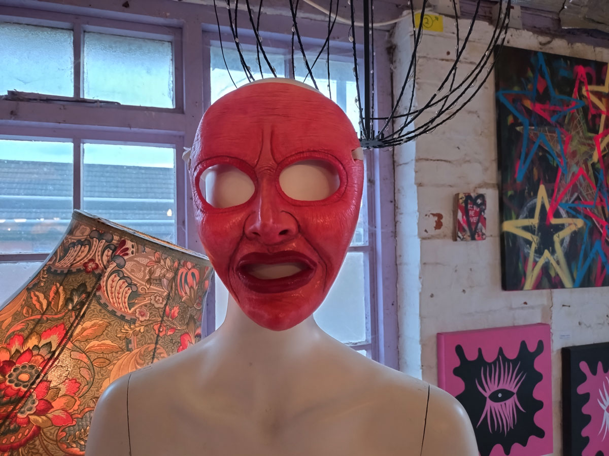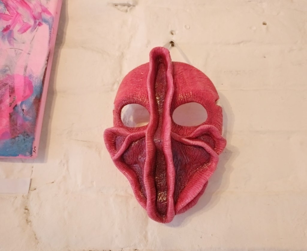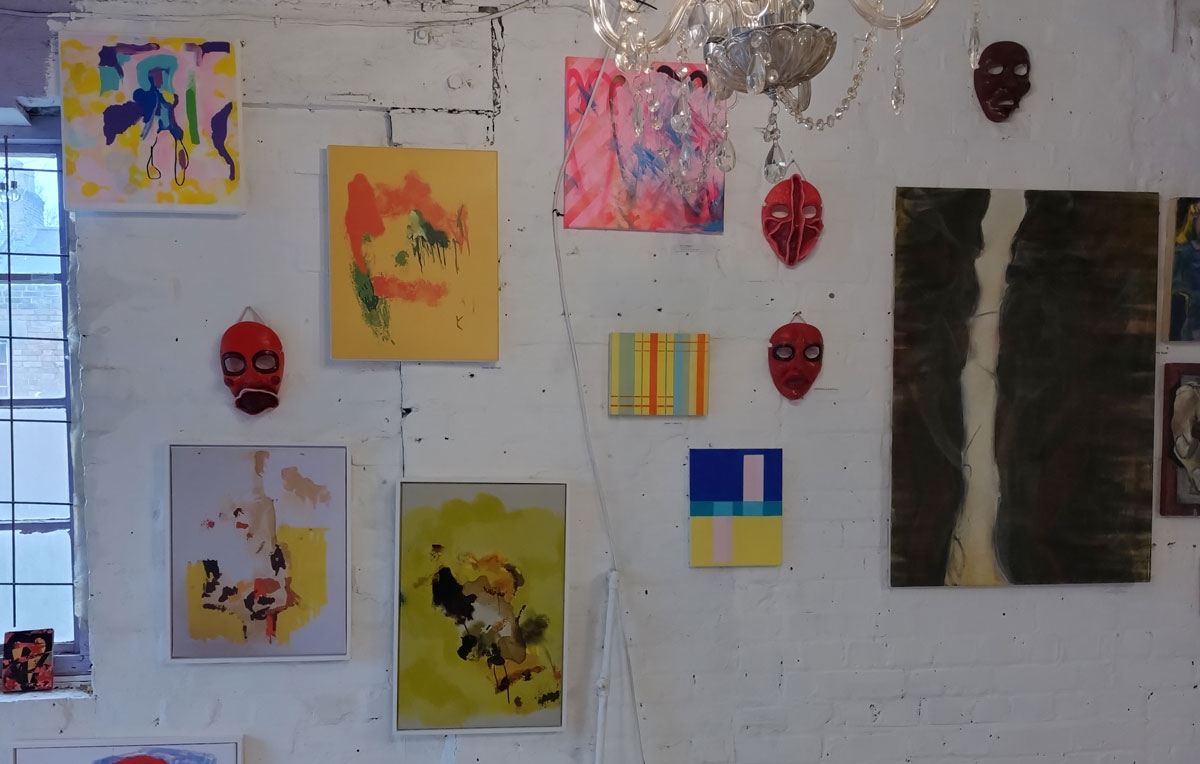 Really wanted some Julia Maddison in this one, she has been showing with Cultivate for ten years or more now, this space particularly lends itself to what she does and who she is (not that we’ve worked out who she is yet, not by any means). meanwhile those Jeremy Scott paintings are dark, weighty, they hang heavy of the old whitewashed brick walls of this space, some kind of gravitas, next to the deliciously red masks of Poppybelle Scicluna and the lines and angles of Mary T. Spence and her refreshing colour. The first time Jeremy has exhibited physically with us after showing in a couple of out online shows. Those two smaller Mary T. Spence paintings are as big as anything in this show, i do like her lines, I do like the choices she makes in terms of her colour.