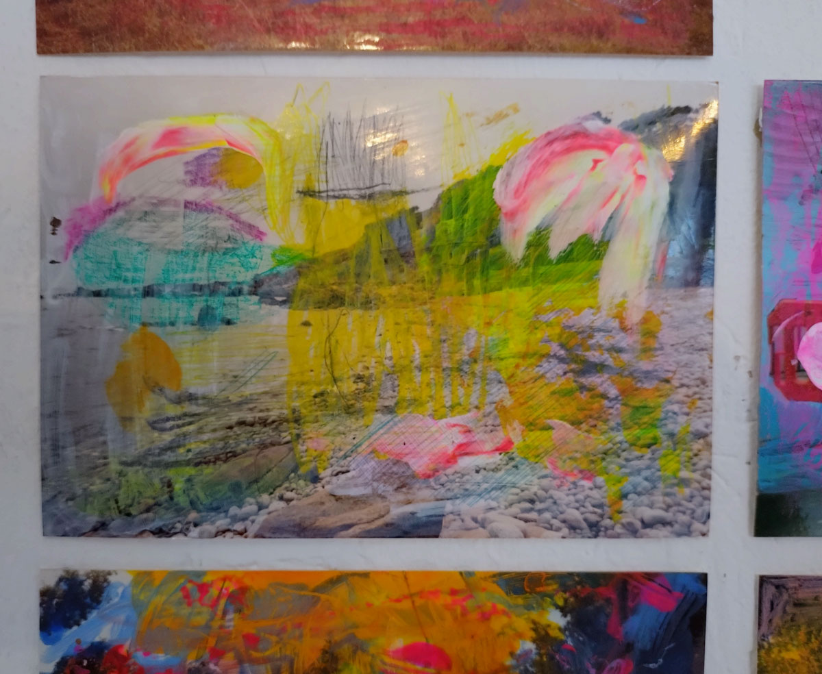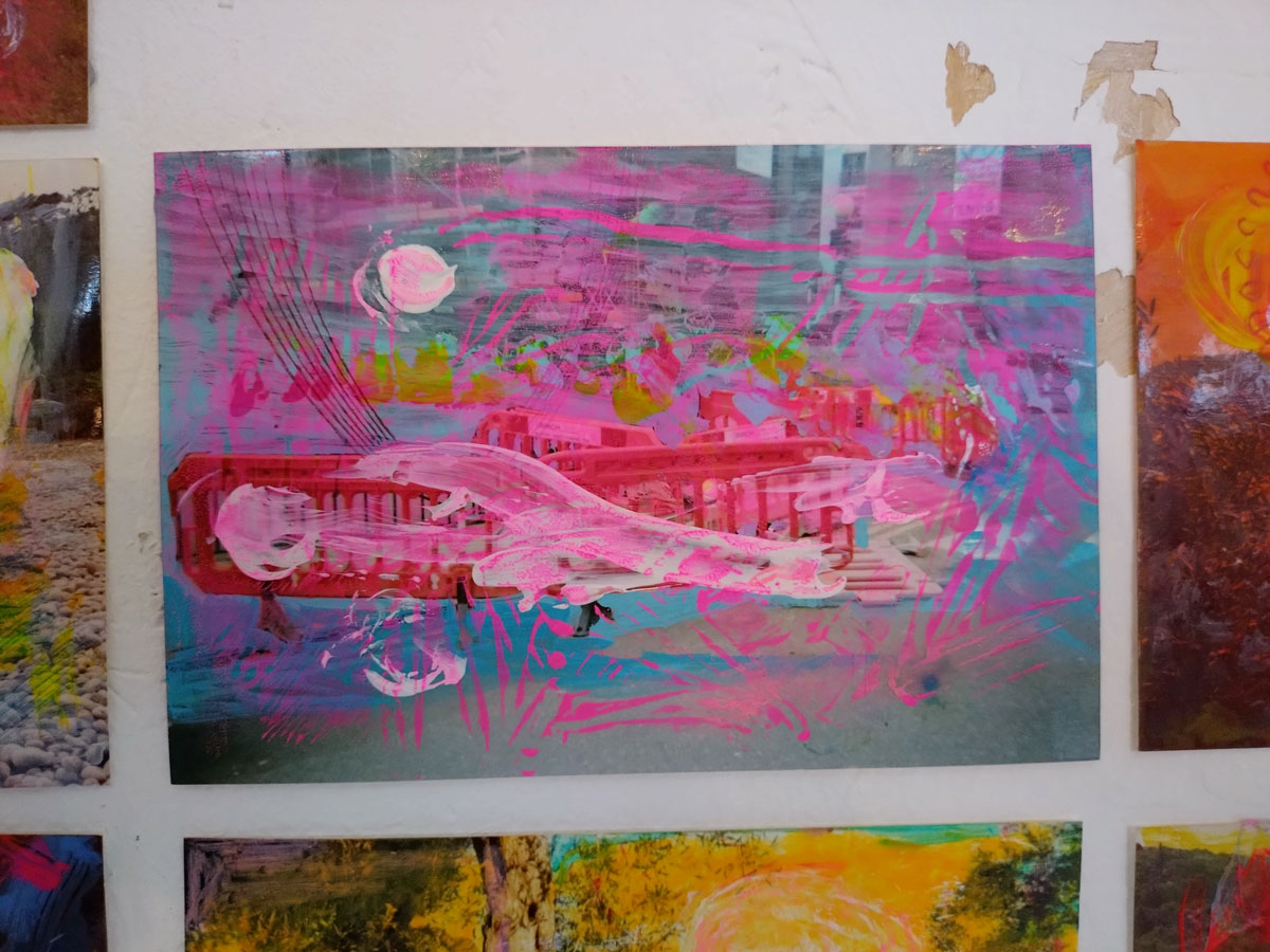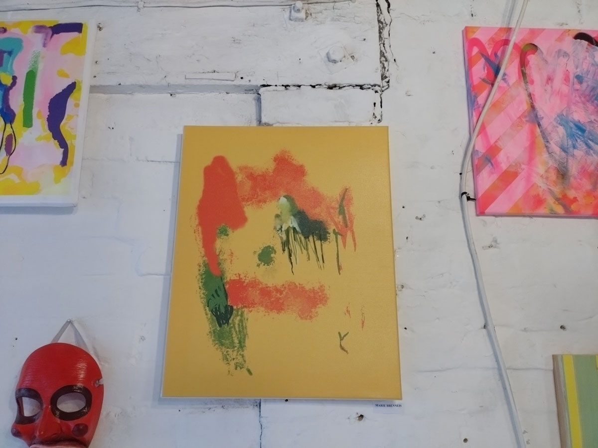Liz Griffiths does really interesting things with (found?) media, old photographs, layers of very painterly paint (or is it ink?), always deliciously coloured, radiant, delicate, considered, quiet where Marie Brenneis and her multi media paintings are rather loud. Marie, who recently took part in our Mixtape No.10 online show, is making her debut with us in terms of physical shows, her work feels a little restrained in here, she needs to be even louder that this space allows, she needs big spaces where she can be even louder (and larger than life) than she is allowed to be in here. Marie’s pieces are part paintings, part prints, abstract multi-media pieces, bold bright colours, kind of like the artist herself – her art really is an extension of Marie herself…