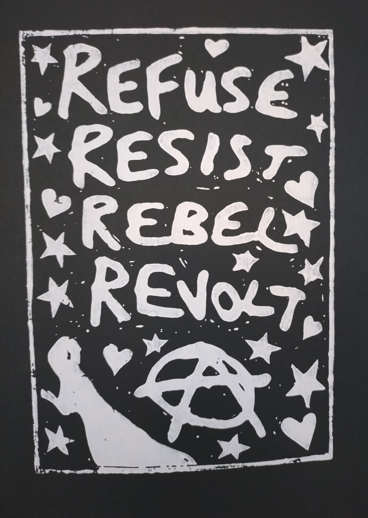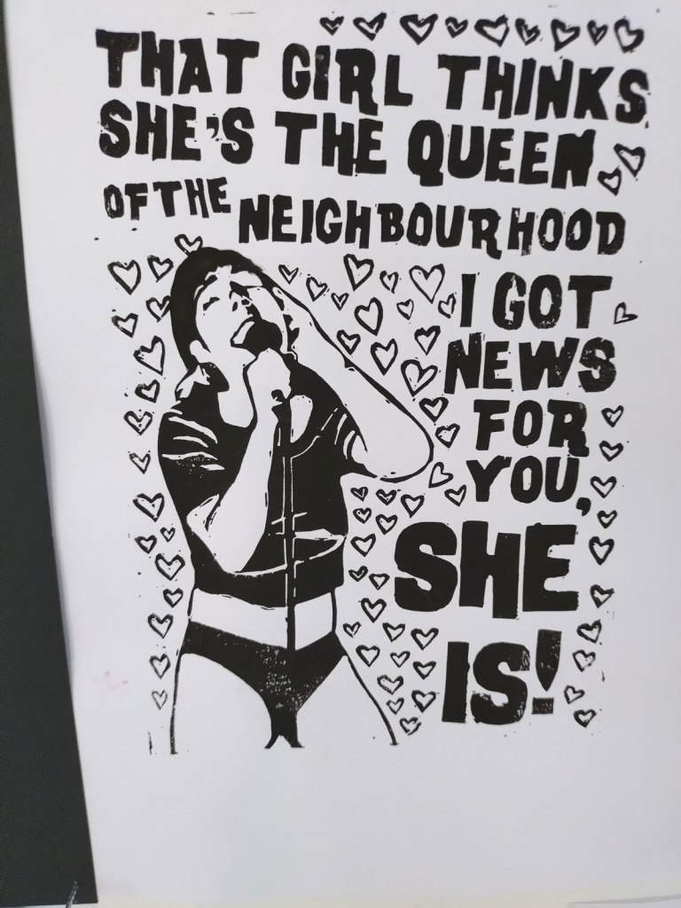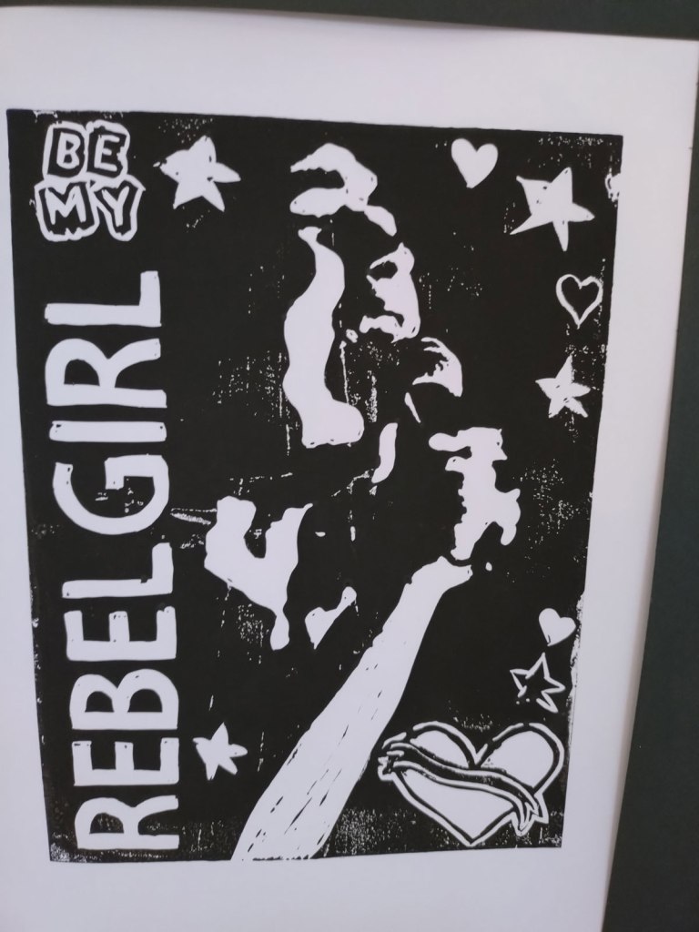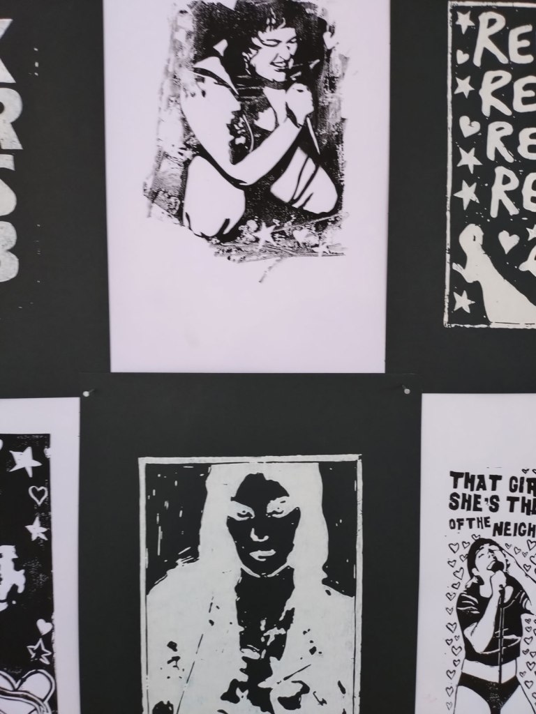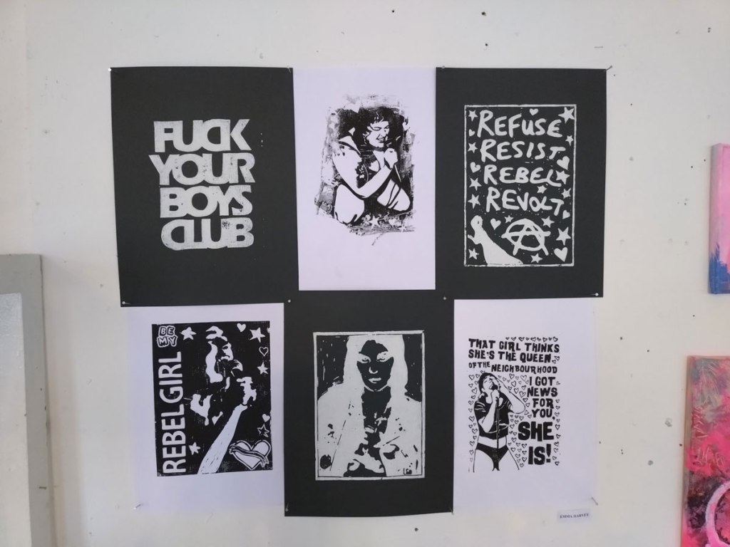 Fellow Cultivate founder Emma Harvey has chosen to hit us with her feminist riot-grrrl side, well not really a side, it is something that runs rather powerfully through all her work, through her dislike of the boys club, through her images that nod to Riot Grrrl band like Bikini Kill or Sissyfit. And there’s Joan Jett once again, Emma’s hand made prints and that positive pop art repeating of things; that block of six prints as one piece really works in here, if only the hang had been a little better at this show, Emma Harvey’s work deserved more space.
