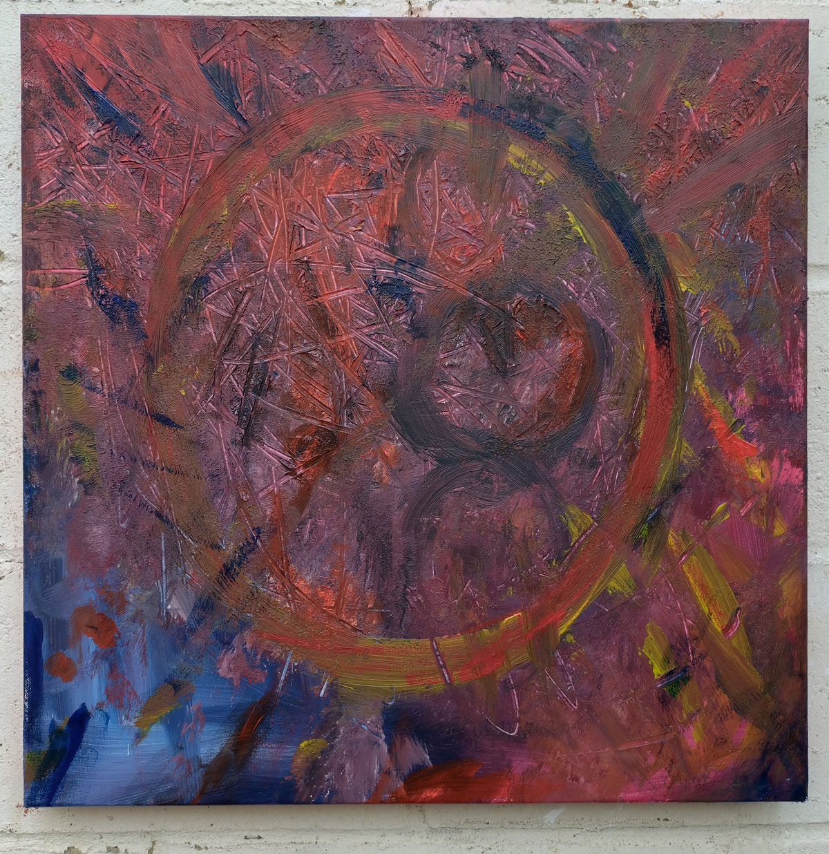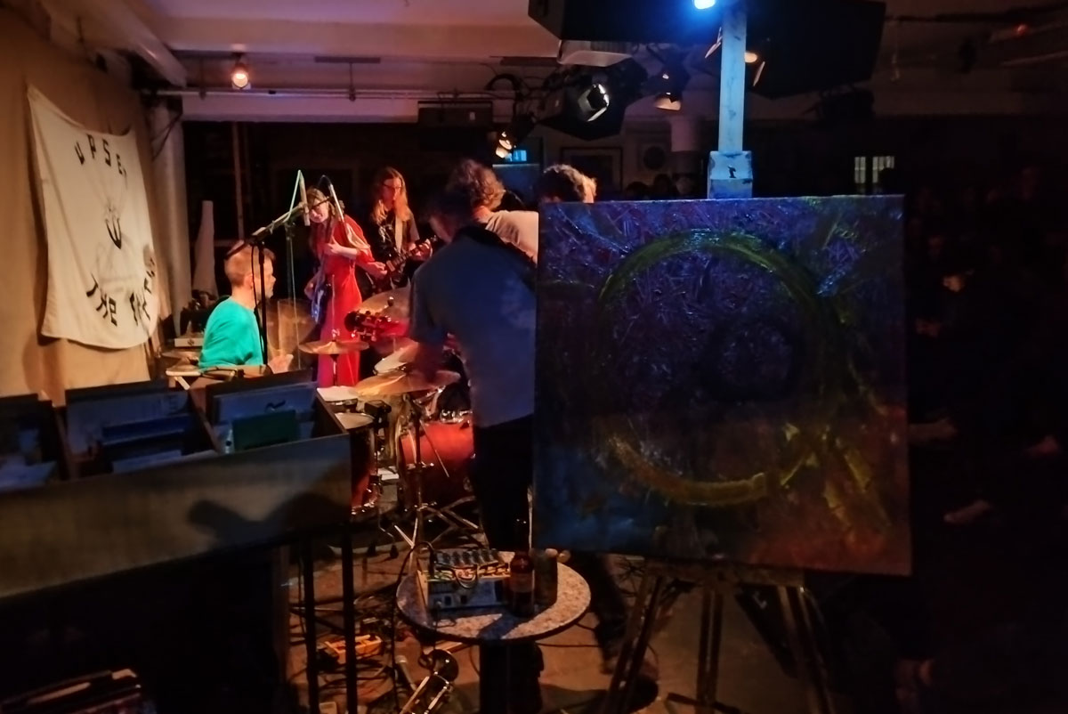 I loved doing it, I really liked trying to connect with it all, I think I maybe might have had something somewhere around mid set, it was a battle, a battle I think I lost. I’d love to try again, I learnt a lot, I would maybe take a tube of gold paint with me next time. on the whole I don’t think it worked. By the next morning I’m being asked by people to post photos of it on social media and I can already see film of me painting behind the band. I see other people have already posted their photos taken in the bad light that makes the piece look even worse than it maybe is. I don’t feel I want to post my own image of it, it is a reasonable request though and I’m certainly not so disappointed that I just want to just write it all off, it isn’t a total failure, so I do share a photo of it on my social media at some point on the morning after the night before, which the band and others immediately re-share which in turn causes more interaction and more questions (all very much welcome). And now the painting has been sitting here in the studio we live in, there is no escaping it, there it looking at me over the weekend, greeting me in the morning, actually I do need to look at it, I don’t want to turn it to face the wall quite yet and now I’m trying to write about the process and the experience and post it all before I go see the band again tonight and that colours things in a different way again.