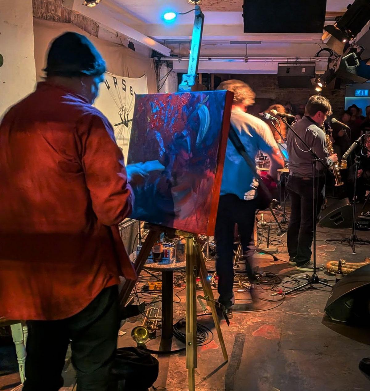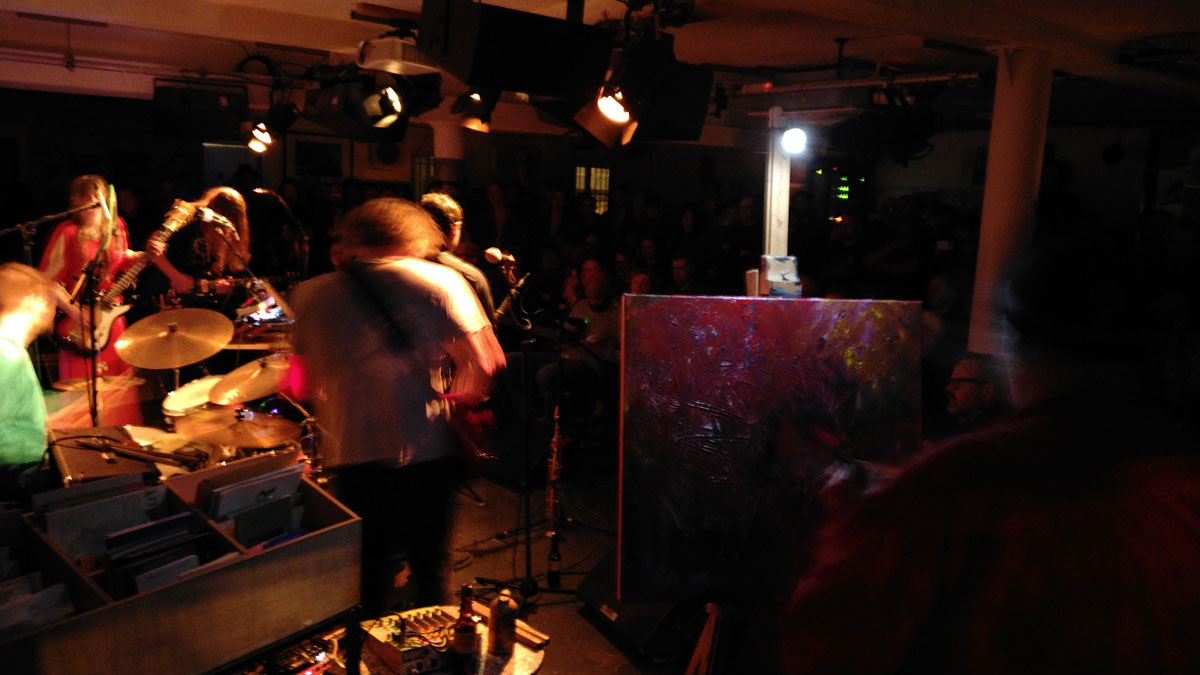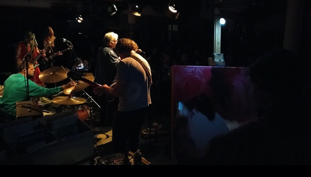 So I’m in the dark squeezing tubes, I’ve got people all around me, painting is usually a private thing – although I have painted live in public on the street, in galleries, at Upfest, it isn’t that allien to paint in public, to almost perform – So I’m in the dark, I’m being photographed and filmed, I’m there in the sight-line of most who are watching the band and I really can’t see what I’m doing. I can’t see the colour, it mostly feels like I have a brown strew of paint on the canvas and I’m almost blindly guessing what adding more red will result in. I’m trying to react to the band, actually I’m behind the monitors rather than in front, this is different, I can’t really get the full sound, the full band, the full power, I’m watching the movement of the drummer, I’m occasionally catching an eye or a nod. I’m not a musician, I imagine this is how jams work, picking up on movement, catching a signal, watching Izzy as she nods, watching John Brennan as he changes things on his drums, trying to catch where the guitar is going or when the saxophone is going to wildly lead us all, I’m squeezing blue paint, a bit of yellow, more bright red, almost violently squeezing tubes, just moving with the speed of the band, trying to move the with movement of the drums, trying to get with their flow, trying to be be part of it, be at one with it all and I’m rather surprised that not I’m really hearing the full band, I’m not hearing the set like I would as part of an audience, not hearing the full body as much as the details. Actually I’m rather looking forward to properly seeing and hearing them again tonight, I don’t think I really saw or heard them last Friday night, I was too busy reacting. Actually i have no idea how long they played for, it went by really quickly, I kept ON painting all the way through, only stopping once Stewart Lee joined them at the end to perform an outrageously under-rehearsed gloriously freeform jazz-punk version of the Robert Calvert/Hawkwind classic Ejection, a brilliant version actually, not sure how familiar this audience are with Captain Lockheed but those who do are wearing great big shit-eating grins as is Stewart Lee, that was certainly an ending to a show! I had stopped before Stewart’s return though, it felr like I had gone as far as i could go on the night.