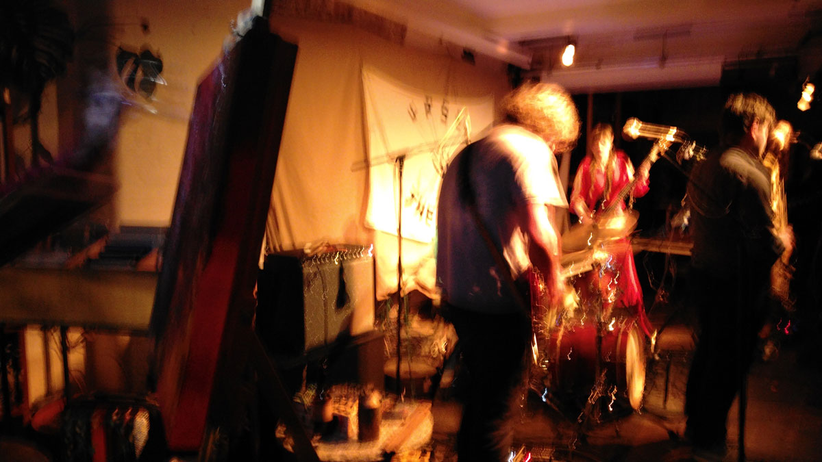A slightly different thing today, I need to write this down before EarthBall return to London again tonight some four days on to play with Orcutt Shelley Miller, for four days ago, last Friday I painted at North London’s Cafe Oto while glorious Canadian avant noise/freeform jazz rock band EarthBall played a headline set at the start of a UK/European tour they are now on. They invited me to come paint, a result I think of something I might have said in one of the many rather positive EarthBall reviews on these pages, something along the lines of how their music makes me want to paint. Truth is lots of things make me want to paint, it is mostly what I do, I am first and foremost a painter. Actually, as some of you might already know, we started this Organ thing way back in a very different world of the last century when we were both teenage art students some thirty nine and a bit years ago, we are artists (or at least like to think we are), And yes, listening to EarthBall recordings very loudly does makes me want to paint, listening to EarthBall recordings very loudly does make me want to try and get on their wavelength and go with their flow. I adore the way they grab hold of something and just go with it and won’t let it go, I love the way that saxophone sometimes screams, I love the almost ecstatic feel of it all, the primal ritual, the way vocals and the lyrics, when you can catch them, joust around the boundaries between chaos and clarity. And there is lots of clarity, I do like the way they grab hold of a musical line and just won’t let it go, I like EarthBall rather a lot and so the invite (or was it a challenge?) to come paint with them was more than gratefully accepted.