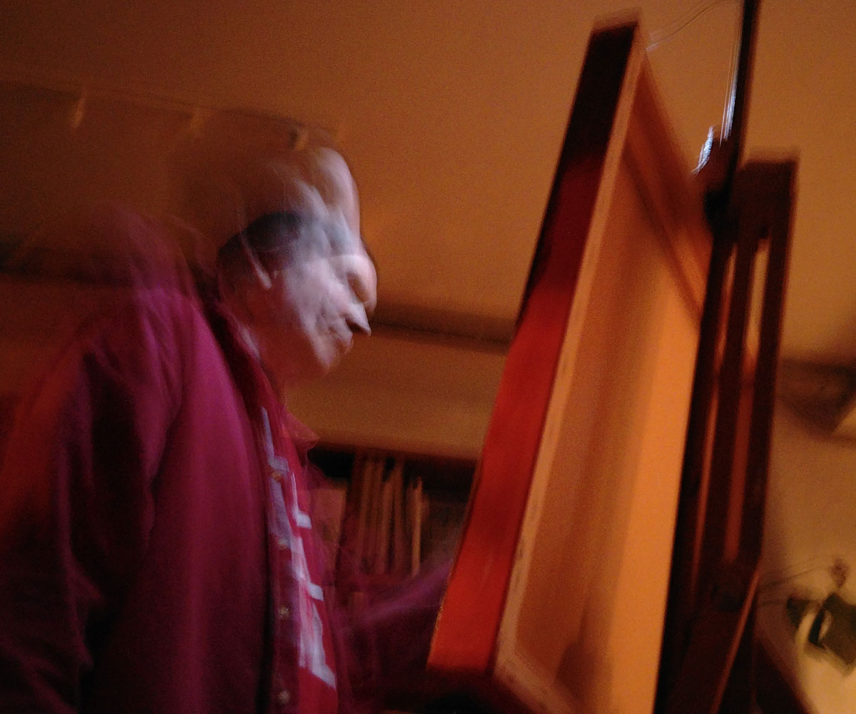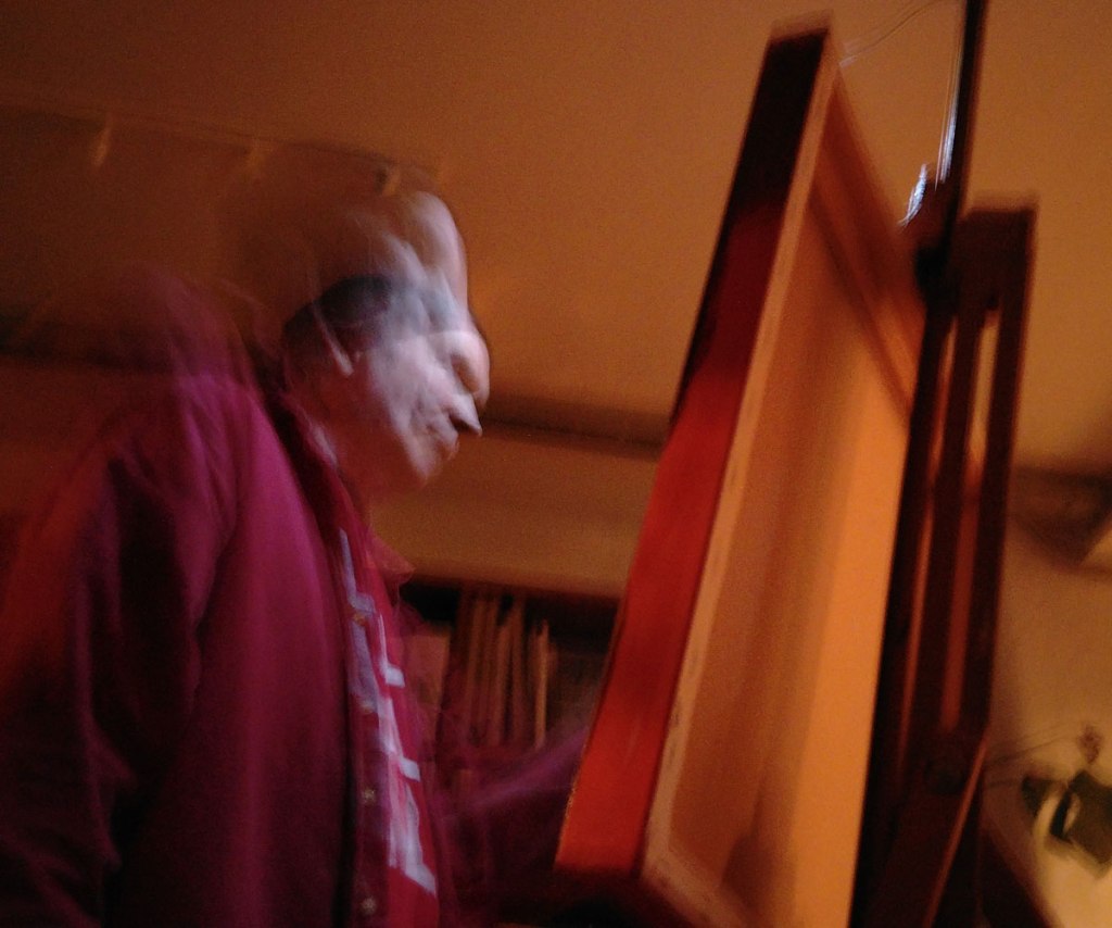 The white of a canvas in always a challenge, there is almost defiance on the part of the canvas, it must be covered, tamed, controlled, defeated, it almost dares you to do so. In hindsight my second mistake (the first being not considering the lighting) was to not let Mr. Lee do his (brilliant) thing before starting, I (rather obviously) should have just waited, I’m (wrongly) improvising and reacting to to what Stewart is saying and that is not what I wanted to be doing, it threw me, I have the white of the canvas covered before he’s left the band to it, there’s a bloody big owl, cats ears. No! The owl and the cat are still there, you can’t see them but I know they are there under the layers…