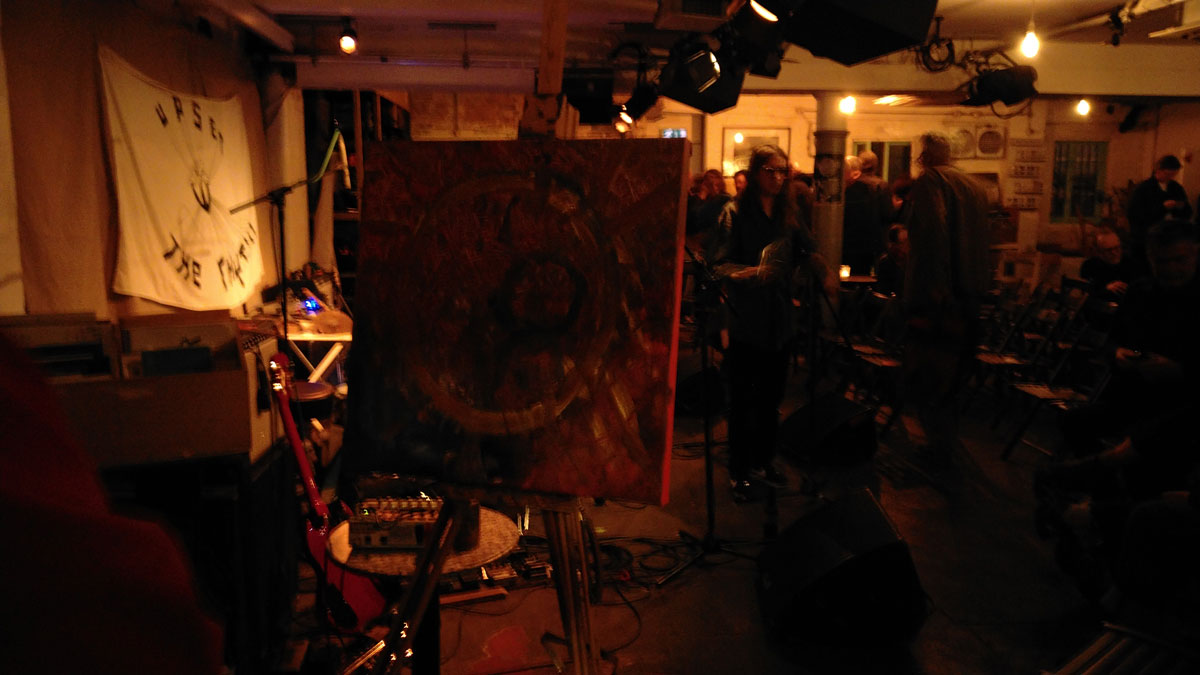 Right now, to answer a question I’ve been asked several times already, I don’t know what I am going to do with the painting yet. I do generally spend a lot of time looking at my paintings before making the next move, sometime a painting can sit here for months waiting before I work on it again (I exhibited two recent painted paintings last week, two paintings that have both now told me they need a lemon and a pear added rather desperately. I don’t know what happens with the EarthBall at Cafe Oto painting, it will probably sit here in full view for days or maybe weeks, it might eventually stay as it is, it should really, it was about that moment, to paint on it now would be like a band going into the studio and adding bits to their supposedly live album afterwards. Then again it might be worked on a little more and who can’t say that whatever Thin Lizzy did in the studio to the live recordings that make Live and Dangerous a far better record of something that essentially happened live didn’t improve things? I might work on this painting a little more, I don’t really know yet. I might make visual notes at tonight’s EarthBall gig and then work on it some more when I get home later. I might eventually just paint over it, whitewash it and use the canvas and some of the texture left to do something new. i will certainly work on the other canvas, the ‘palette’ canvas. Whatever happens, I loved doing it, this is all something to be continued. A big thanks to EarthBall, Cafe Oto, Christopher and Upset The Rhythm and yes, a big thanks to Stewart Lee (probably). And yes, I do need to write about the two other bands (duos) on the bill, I haven’t forgotten that, both CIA Debutante and Split Apex proved to be worthy of attention (watch this space) and watch this space in terms of what happens with this painting, there was talk of of the Oto set being the next in the series of EarthBall live album releases and that it might be needed as part of the cover. Right now I’m enjoying the texture of the painting rather than the look of it… Watch this space, to be continued… (Sean Worrall)